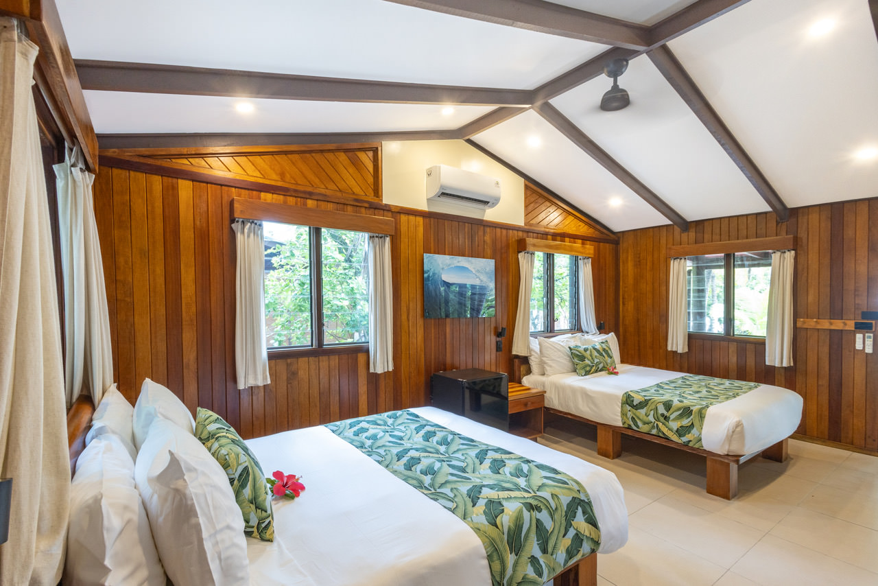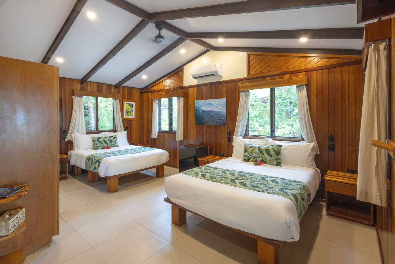 Our traditional Fijian Beach Bures are the essence of Tavarua Island’s accommodations. With a classic design, locally sourced art and photos and a deck overlooking tropical palms and ocean views, this is comfort and simplicity at its finest. Each bure has two queen size beds and one day bed, and can accommodate three single adults or up to five as a family